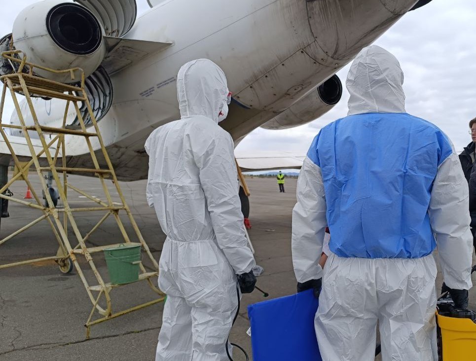 После этого началась дезинфекция. Она включает абсолютно всё внутри, в том числе пилотскую кабину, и проводится только специальными растворами для воздушных судов.