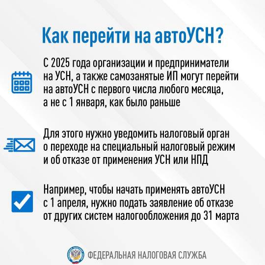 С 2025 года организации и индивидуальные предприниматели, применяющие УСН, и самозанятые ИП вправе перейти на автоУСН с первого числа любого месяца, а не с 1 января, как было раньше. Для этого нужно уведомить налоговый орган о переходе на специальный налоговый режим и об отказе от применения УСН или НПД. Например, чтобы начать применять автоУСН с 1 апреля, то подать заявление об отказе от других систем налогообложения нужно до 31 марта.