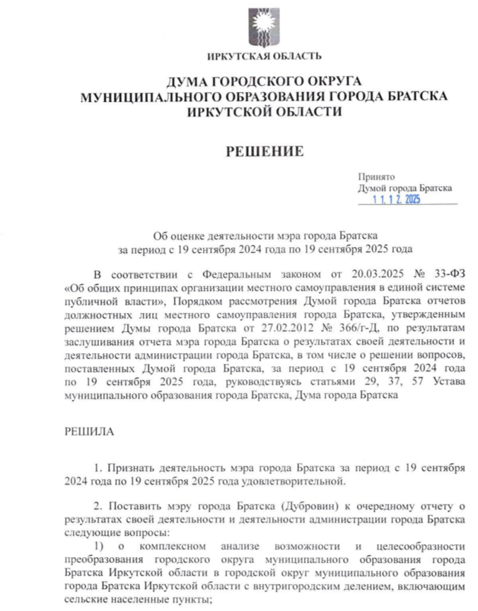 В документе указано, что работа мэра Братска и администрации города за период с 19 сентября 2024 года по 19 сентября 2025 года признана депутатами удовлетворительной. Кроме этого обозначены вопросы, на которые глава города должен будет ответить через год. В их числе: