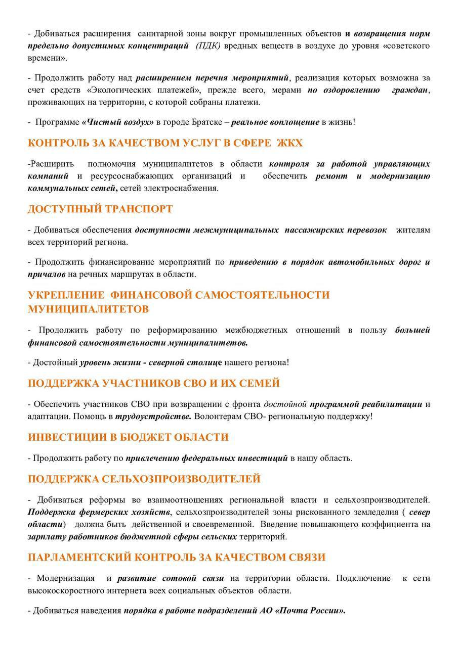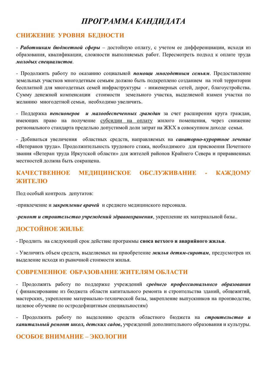 Она сформирована, исходя из моей практической работы в Законодательном Собрании и анализа пожеланий и наказов избирателей – жителей города Братска и области в целом.