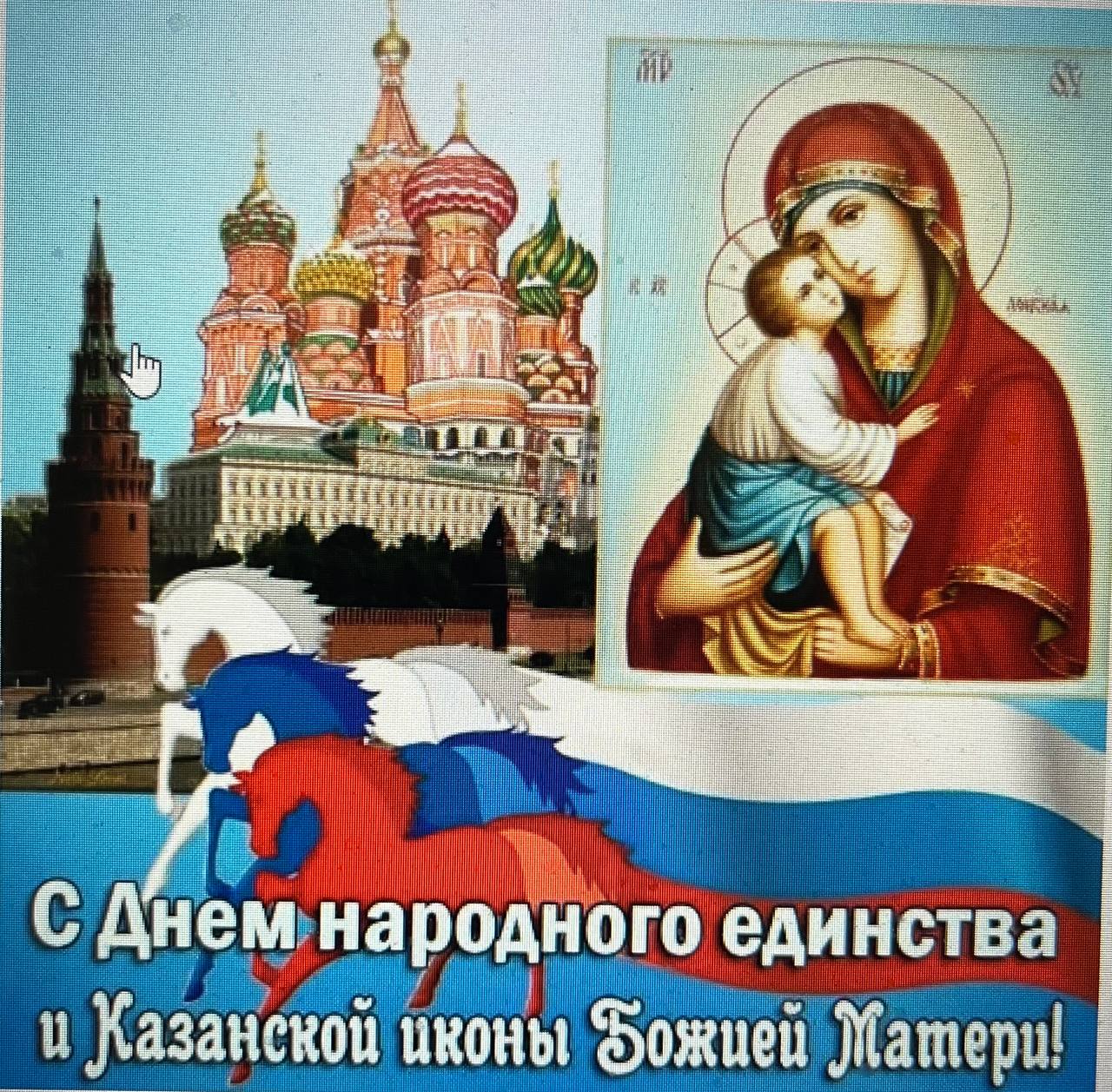 Дорогие друзья, поздравляю всех вас с очень важными для нашего народа праздниками – Днем народного единства и Днем почитания Казанской иконы Божией Матери! Эти праздники связаны исторически: чудотворный образ иконы чествовали еще в дореволюционной России, в благодарность за избавление Москвы и всей России от нашествия поляков в 1612 году.
