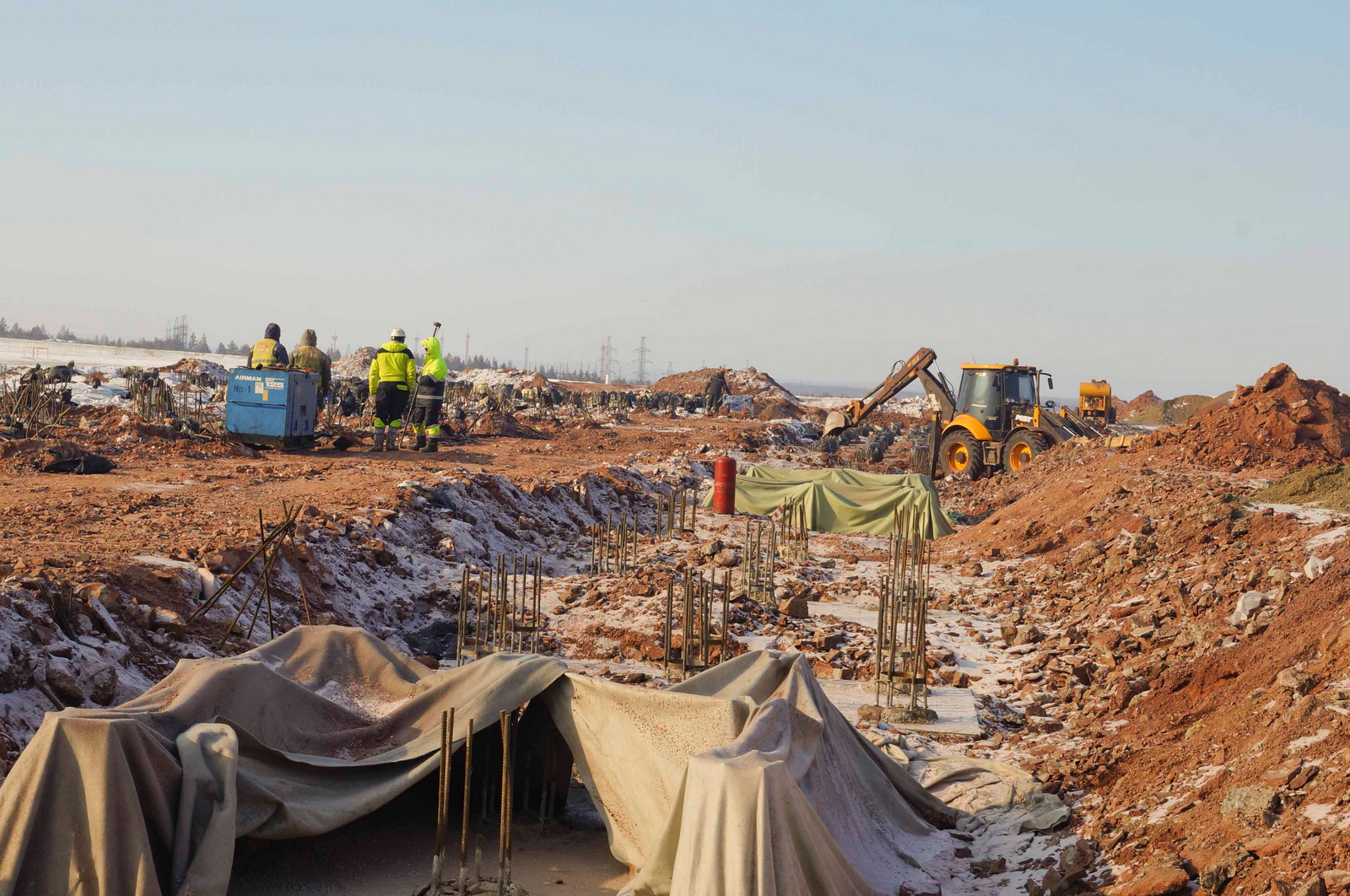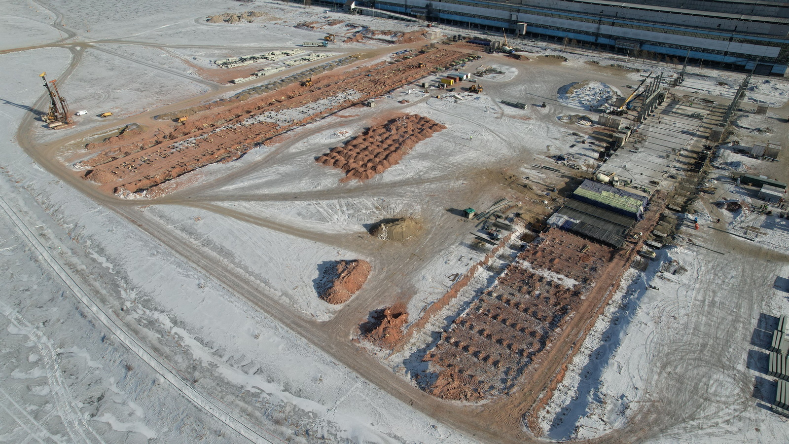 В 2023 году были проведены работы по вертикальной планировке участка под строительство. В данный момент завершен первый этап подготовки свайного основания под корпуса электролиза в осях 65–104.