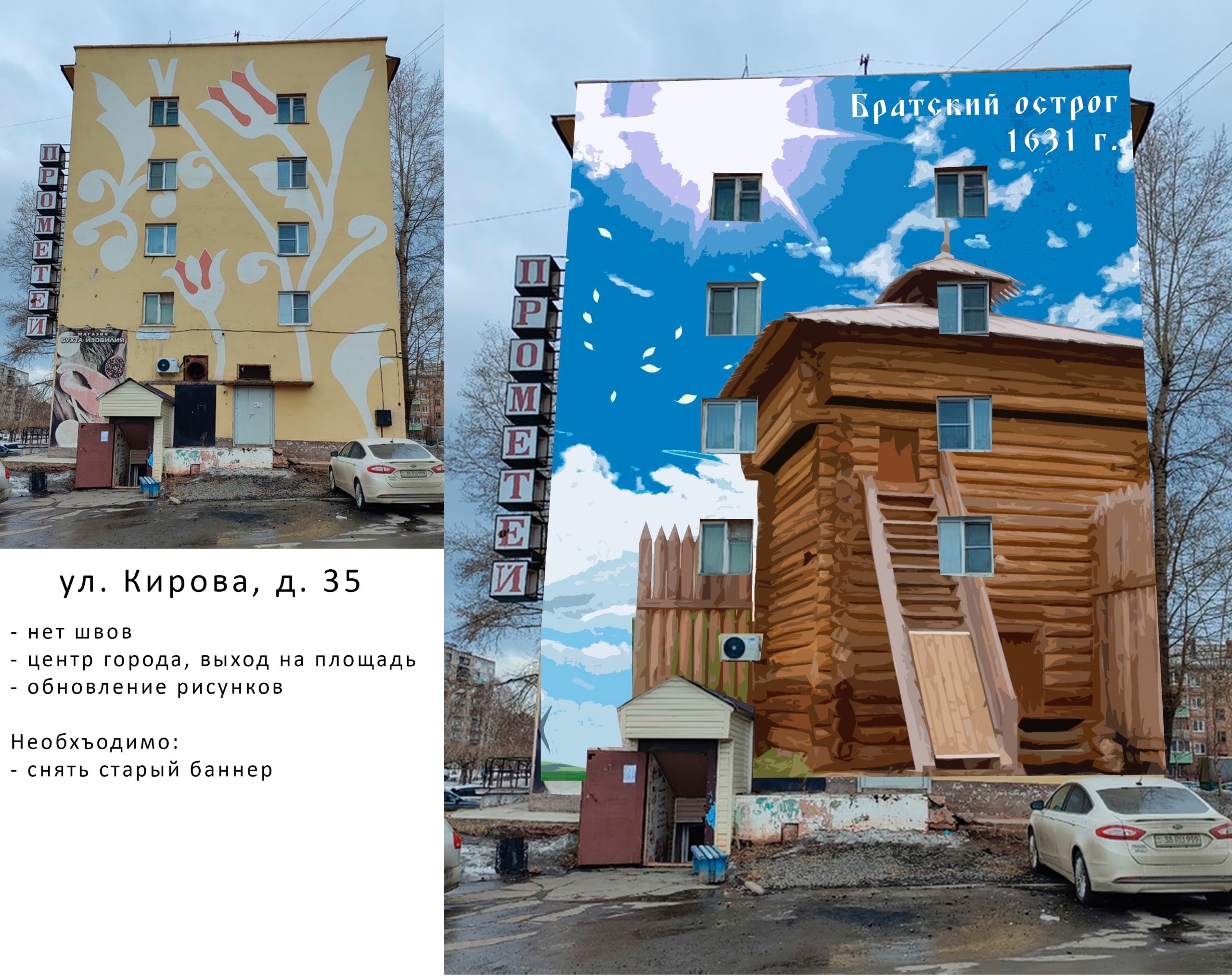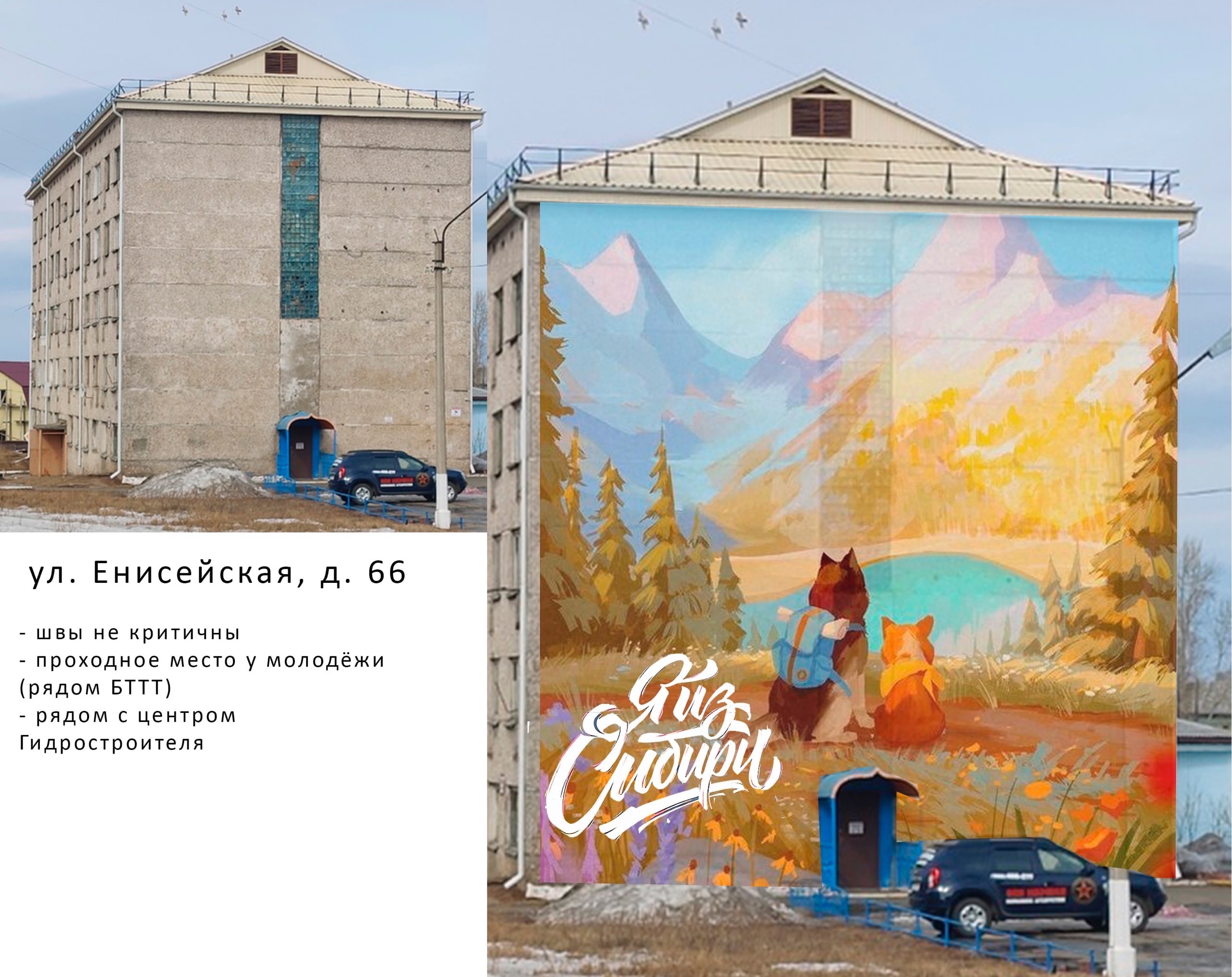 Один многоквартирный дом в каждом административном районе Братска украсят муралы (большие изображения, нанесённые на стены, в данном случае – на фасады жилых домов). Адреса домов уже определены, примерные эскизы готовы. Они размещены на странице «Вконтакте» автономной некоммерческой организации (АНО) «Ярко» – сообщает информационное агентство «ТК Город». Уточняется, что организация выиграла президентский грант в размере 2 миллиона рублей и на эти средства будет наносить муралы на дома не только в Братске, но и в Нижнеудинске и Усть-Илимске. В Братске большие картины появятся на торцах домов по улице Приморская, 27 (здесь изобразят вид на Братскую ГЭС), по улице Кирова, 35 (тут «появится» Братский острог) и по улице Енисейской 66. В последнем случае будут изображены красоты сибирской природы. В сообщении АНО «Ярко» отмечается, что работы по созданию муралов начнутся в летний период. Предварительно на каждый рисунок уйдёт около недели.