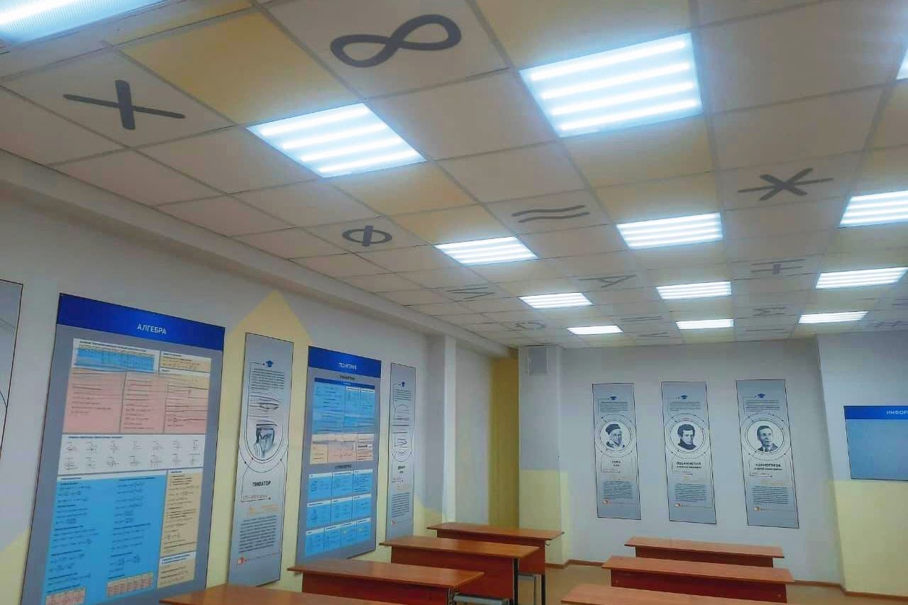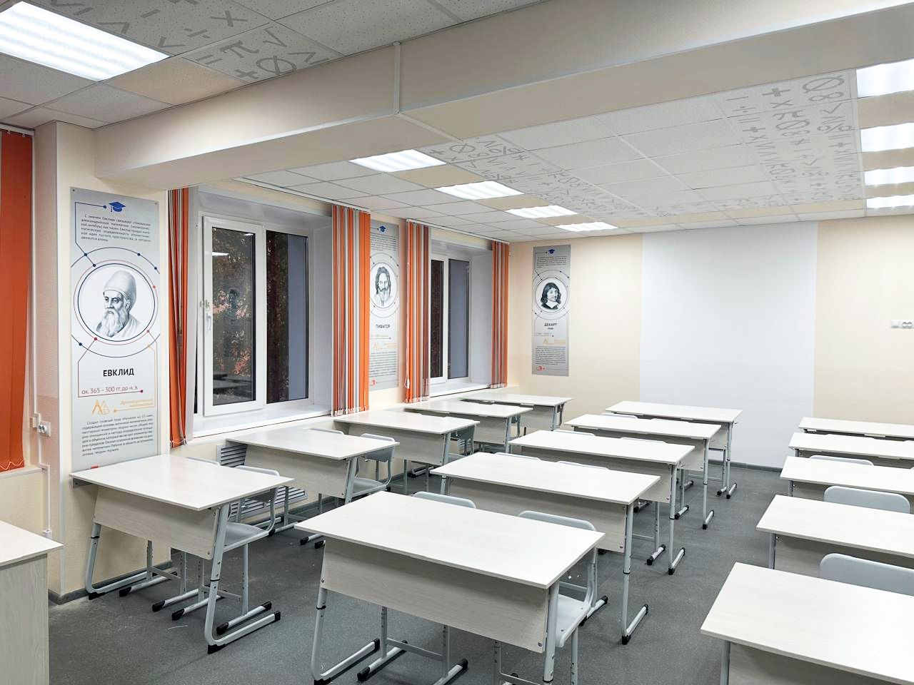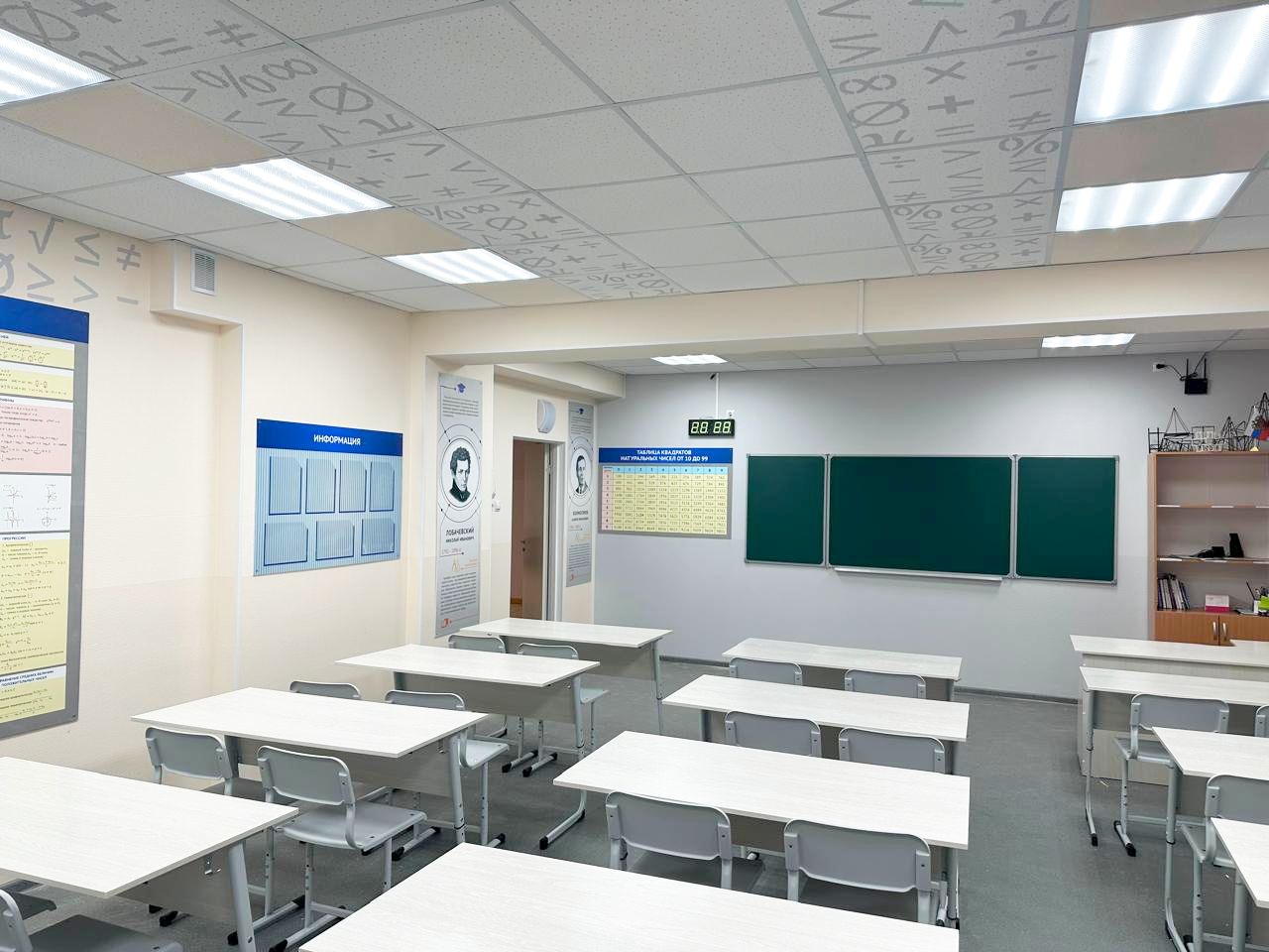 Для кабинетов приобретено современное интерактивное оборудование и компьютерная техника, в помещениях произведена замена окон, систем отопления, полов, дверей, смонтированы светодиодное освещение и новые потолки, отремонтированы стены, установлены новые парты, стулья, шкафы, информационные стенды.