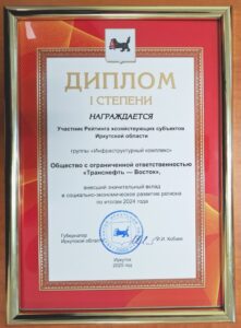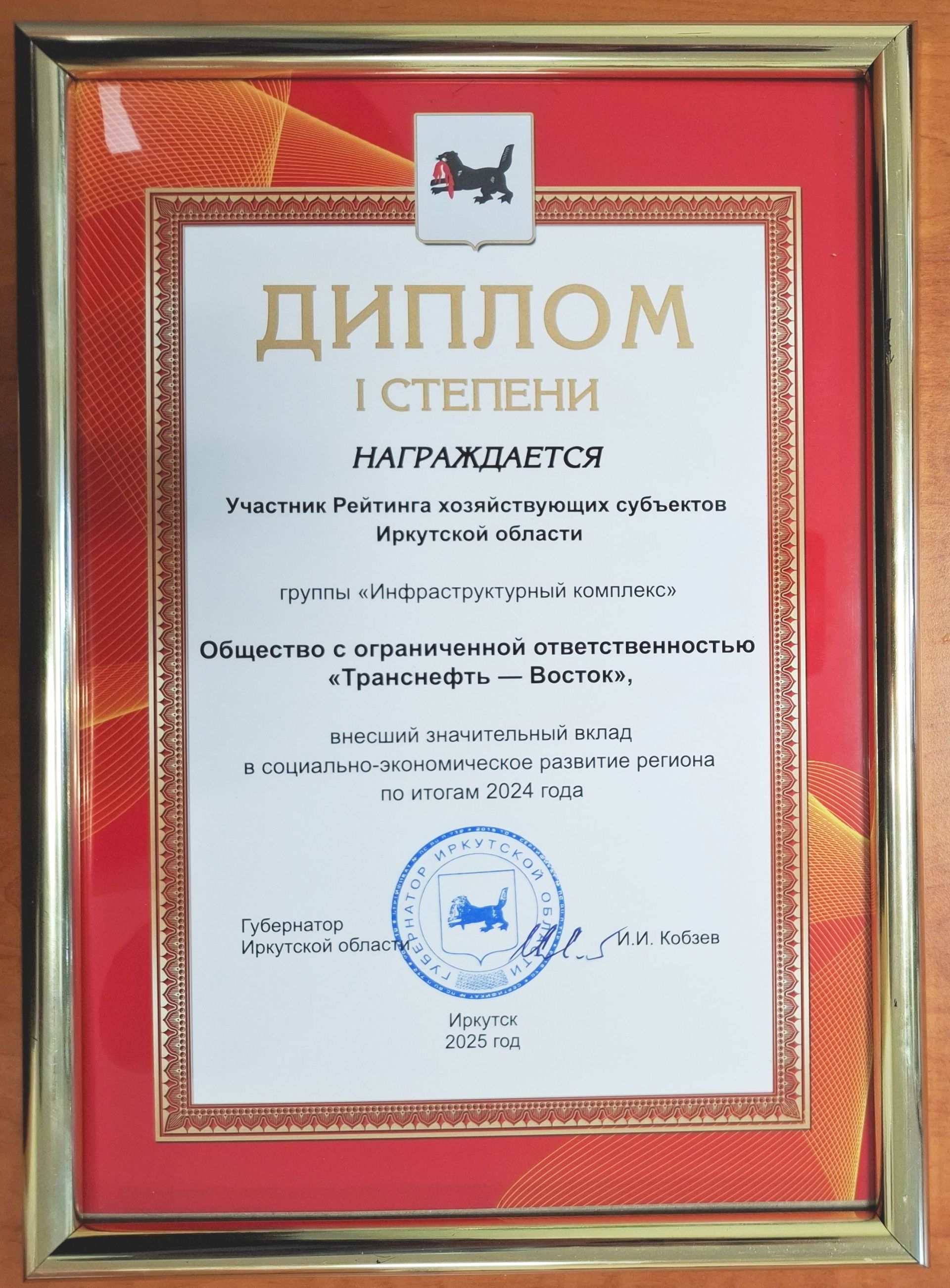 ООО «Транснефть – Восток» (дочернее предприятие ПАО «Транснефть») заняло первое место в группе «Инфраструктурный комплекс» ежегодного рейтинга хозяйствующих субъектов Иркутской области.