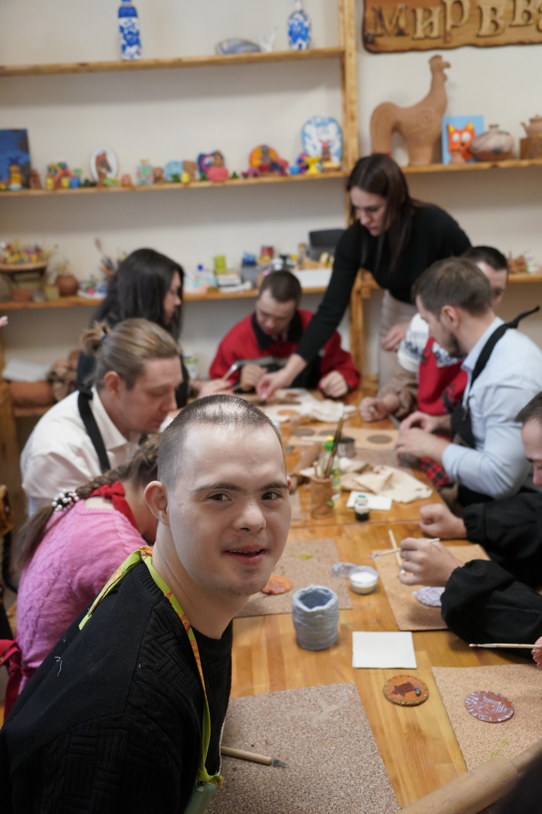 Гончарная мастерская в Центре социальной реабилитации работает более двух лет. В уютной атмосфере особые ребята создают нехитрые поделки: с полок огромными глазами искренне смотрят на гостей медведи и лисы, расписные куклы, красуются на полках яркие чашки, тарелки и кувшины космических расцветок. Работать на гончарном круге дети научили и гостей.