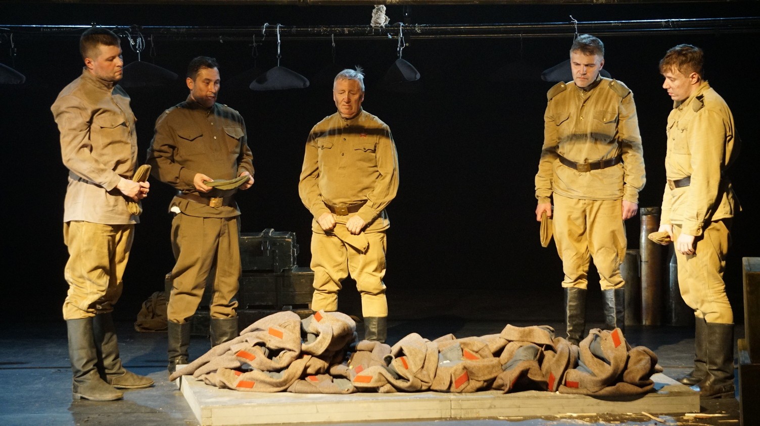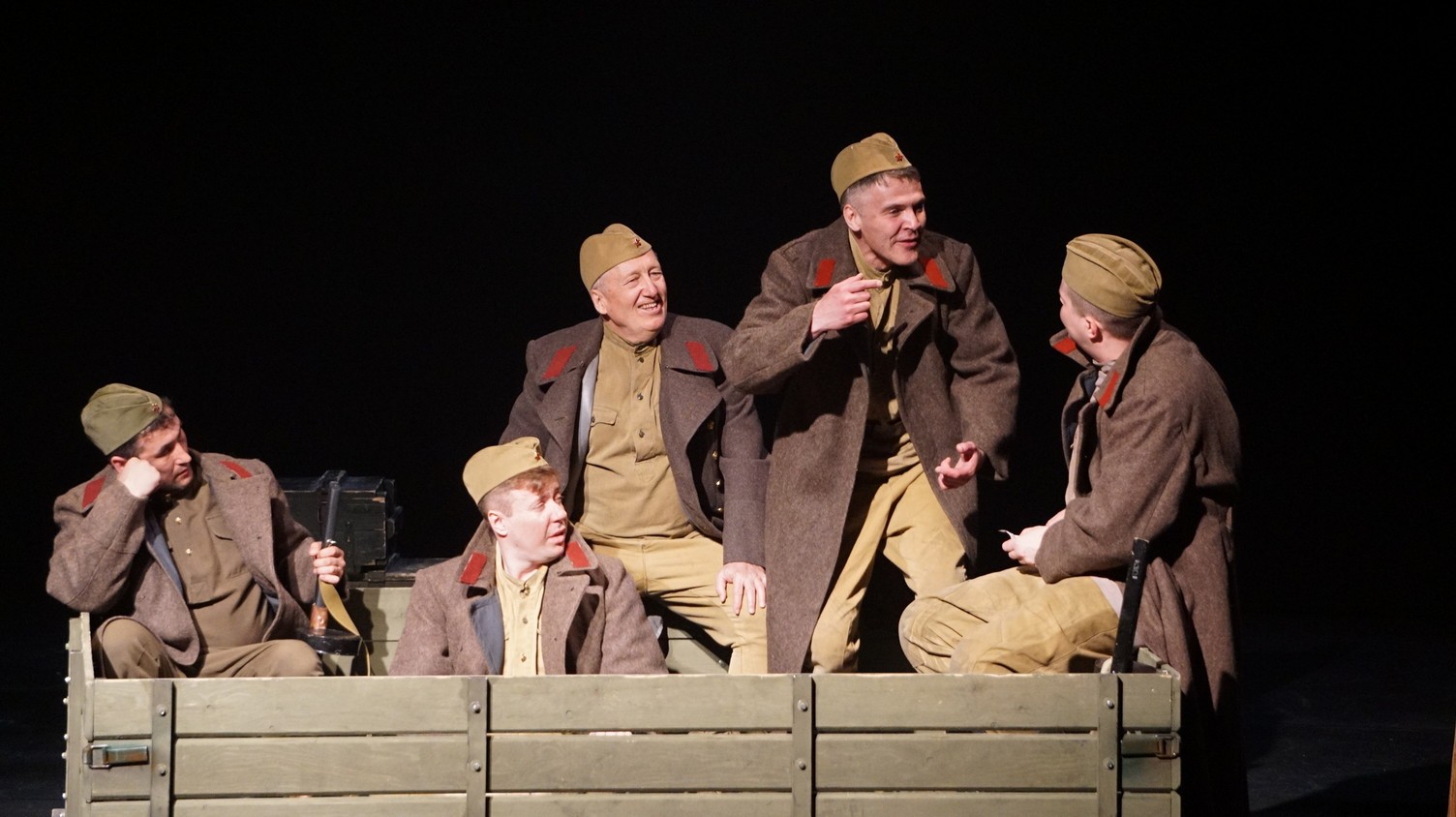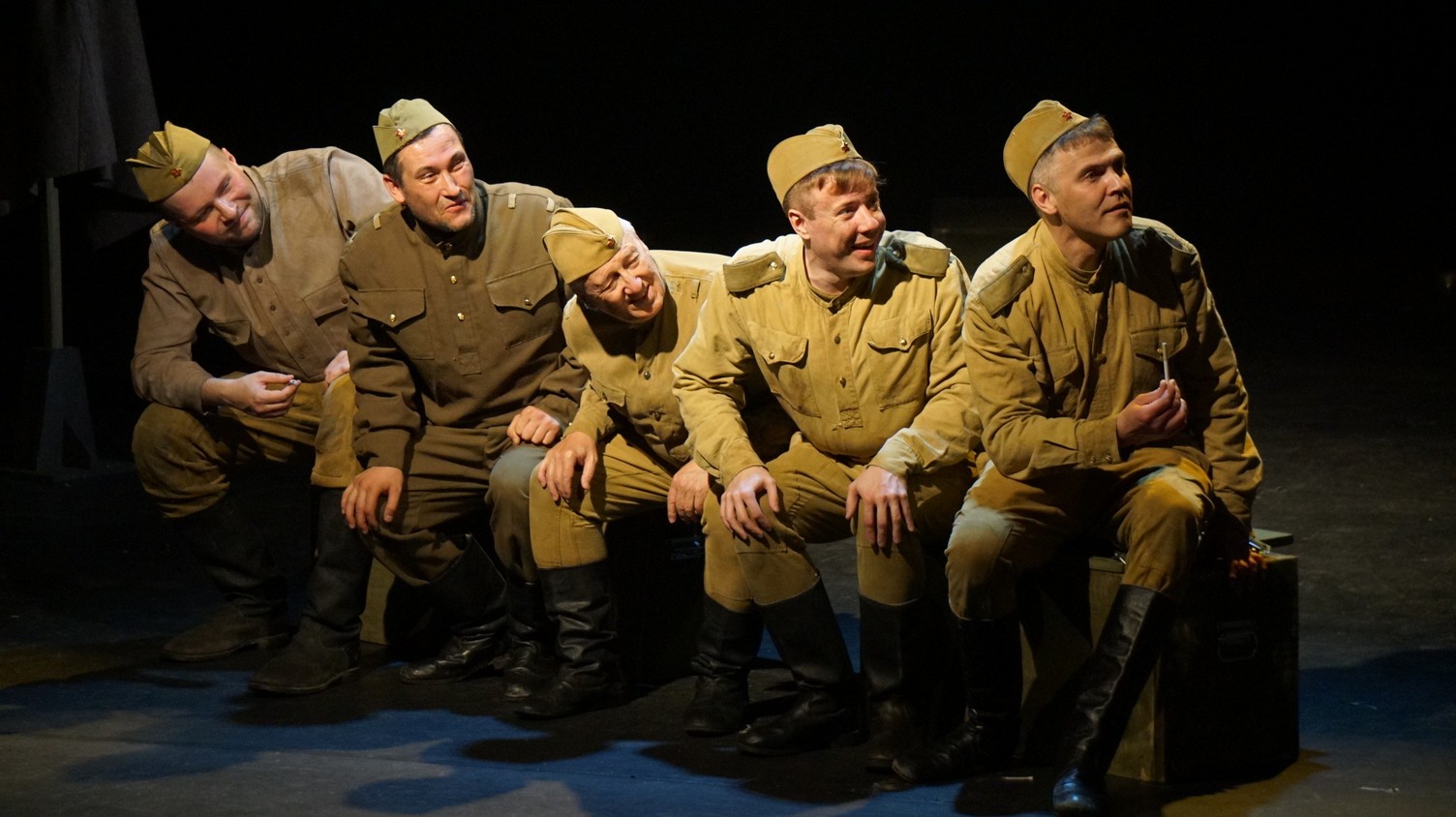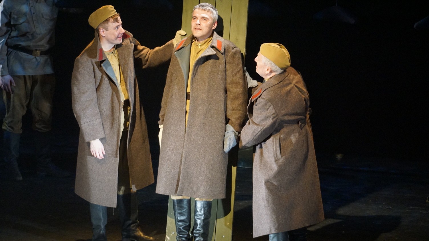 И у каждого актера, занятого в спектакле – у Владимира Куликова, Сергея Терпугова, Павла Жилина, Алексея Павлова, Антона Коцуренко Светланы Светлаковой – есть свое личное отношение к военному прошлому. У Сергея Терпугова дед – пехотинец закончил войну в Германии. У Алексея Павлова воевал дед, а прадед погиб под Сталинградом… Во всех нас глубоко «зашит» Василий Теркин. Он – в генетической памяти народа. Отсюда и постановочный ход – нет главного героя, герои – все, в каждом актере есть частица Теркина. И единственный женский образ – он тоже собирательный. Поэтому каждый актер стал частью сообщества, объединенного одними мыслями и чувствами. Так же работала художник- постановщик Наталья Корнева, так трудились все цеха театра. И художник по свету Елена Алексеева, приехавшая на постановку из Новосибирска: