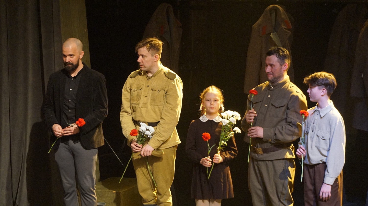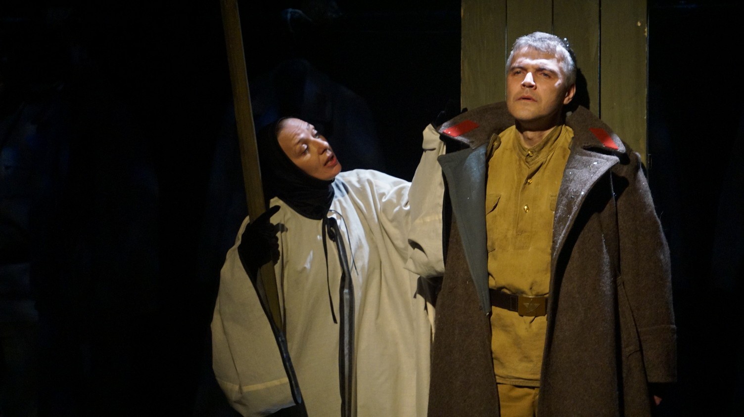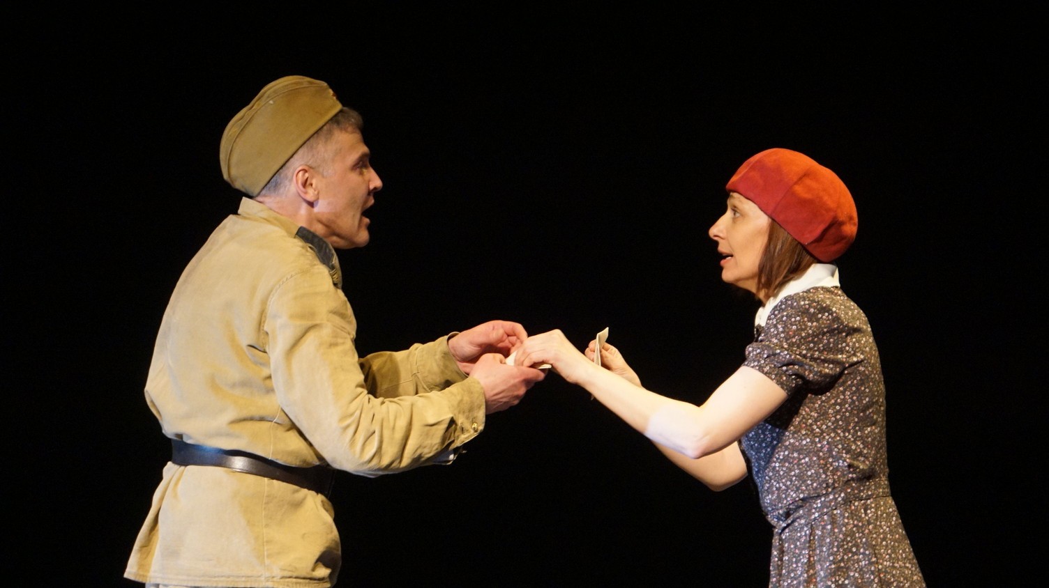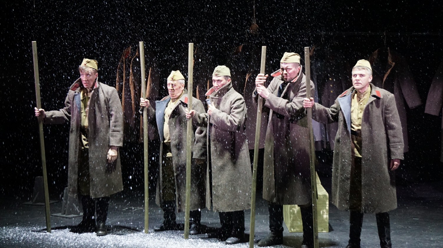 И у каждого актера, занятого в спектакле – у Владимира Куликова, Сергея Терпугова, Павла Жилина, Алексея Павлова, Антона Коцуренко Светланы Светлаковой – есть свое личное отношение к военному прошлому. У Сергея Терпугова дед – пехотинец закончил войну в Германии. У Алексея Павлова воевал дед, а прадед погиб под Сталинградом… Во всех нас глубоко «зашит» Василий Теркин. Он – в генетической памяти народа. Отсюда и постановочный ход – нет главного героя, герои – все, в каждом актере есть частица Теркина. И единственный женский образ – он тоже собирательный. Поэтому каждый актер стал частью сообщества, объединенного одними мыслями и чувствами. Так же работала художник- постановщик Наталья Корнева, так трудились все цеха театра. И художник по свету Елена Алексеева, приехавшая на постановку из Новосибирска: