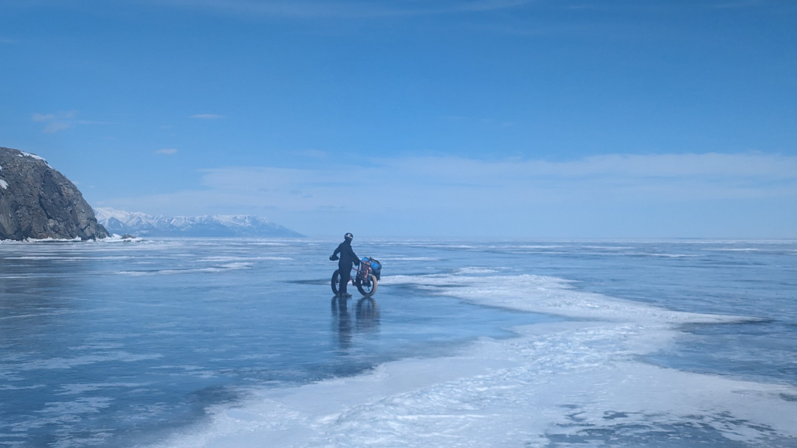 - Для поездок в зимний период, и в частности, для Байкала был приобретен фэт-байк, велосипед на колесах с шипованными покрышками шириной 5 дюймов, – рассказал Борис Петухов. – Вообще, Байкал каждый год разный. Возможно, в этот раз, было бы проще передвигаться на узких колесах. Но в тех моментах, когда велосипед приходилось толкать, широкие колеса – большой плюс. В этом году льда было гораздо больше, чем обычно. Практически до мыса Елохин мы прошли по льду, чего обычно в это время года на Байкале не бывает.