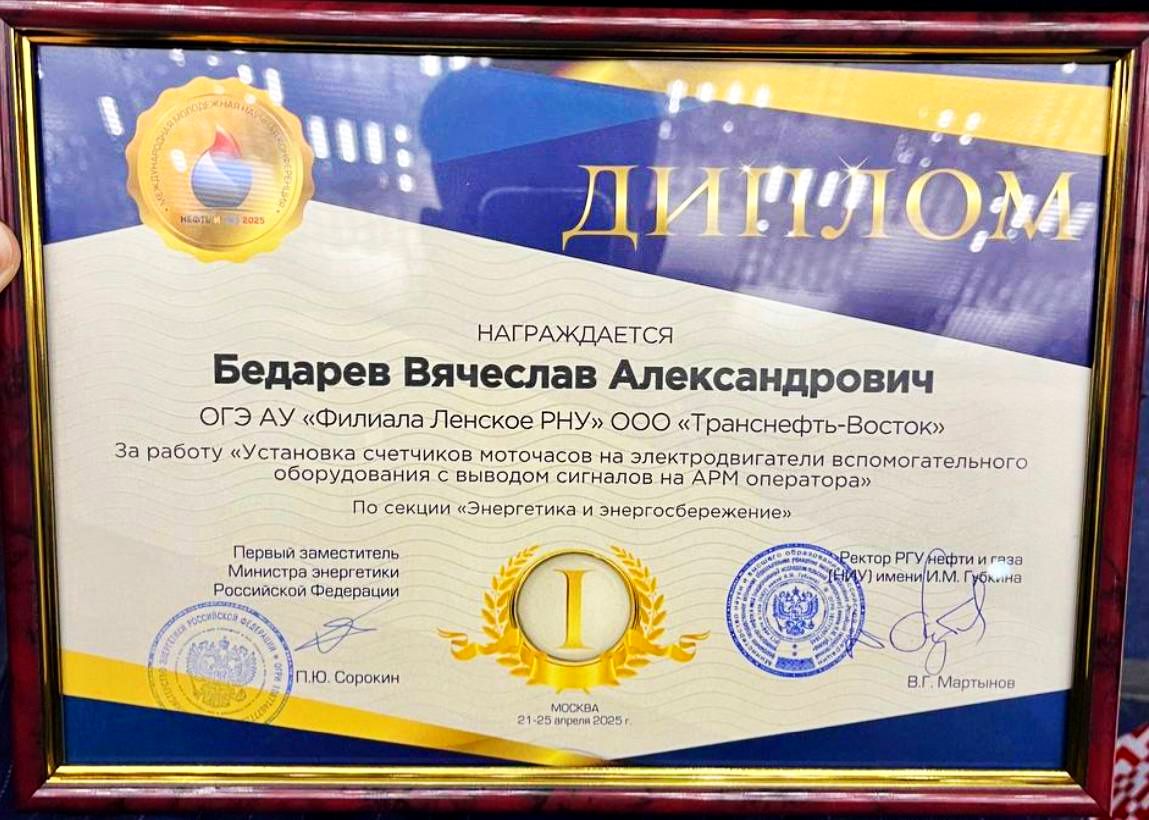 Инженер-энергетик ООО «Транснефть – Восток» Вячеслав Бедарев получил диплом первой степени на 79‑й Международной молодежной научной конференции «Нефть и Газ» в секции «Энергетика и энергосбережение».