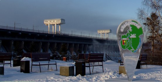 На смотровой площадке Братской ГЭС появился новый арт-объект. Это пиктограмма геолокации, выполненная из прозрачного материала и высотой примерно два метра. На ней изображена Иркутская область и отмечен Братск.