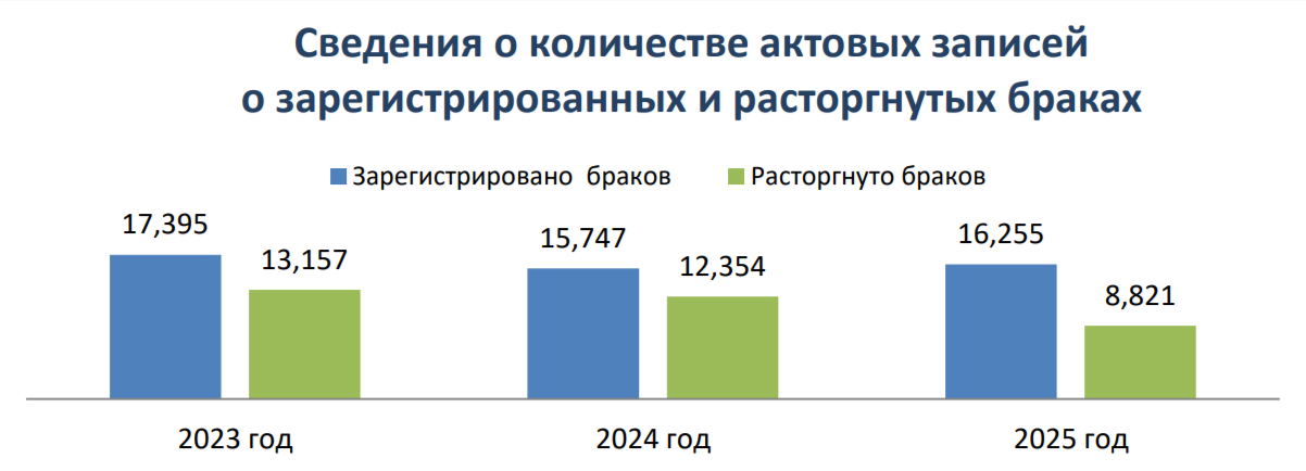 В то же время число браков примерно остается на одном уровне и за последние годы меняется незначительно. Так, в 2025‑м 16 255 пар изъявили желание создать семью. Это на 3,2% больше, чем в 2024‑м (15 747), однако на 5,6% меньше, чем в 2023‑м (17 395).