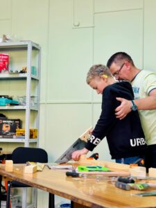 - Проект «Столярная мастерская» создан в партнерстве с благотворительным фондом «Улыбка в сердце» и направлен на социализацию и профориентацию подростков с особенностями в развитии здоровья, завершивших школьное обучение, – рассказал автор проекта Артем Снежко-Блоцкий. – Мы ставим себе цели обучить детей основам столярного дела, сформировать полезные навыки, развить их творческие способности. На первом занятии подростки познакомились с техникой безопасности, узнали, как безопасно пользоваться ножовкой и не поранить себя.