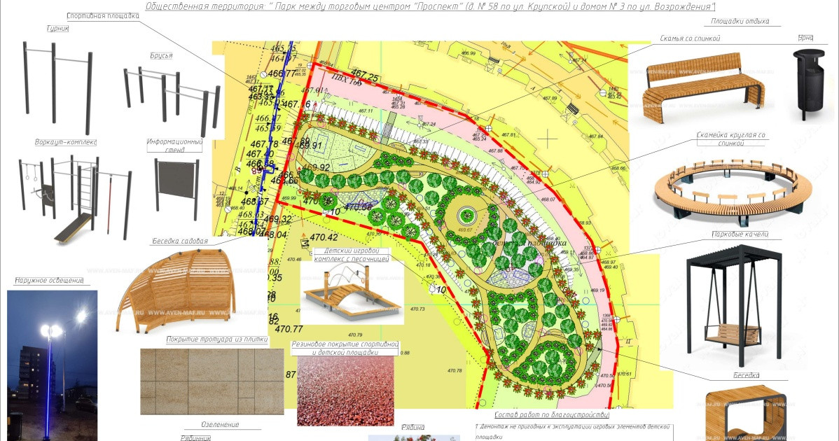 Кроме того, спортивную площадку с установкой воркаут элементов – турник, брусья, воркаут комплекс (с покрытием из монолитной резины). Также проект предусматривает площадку для детей младшего возраст, которая включает детский игровой комплекс с песочницей. На всей территории объекта благоустройства будутсмонтированы 16 торшерных опор освещения.